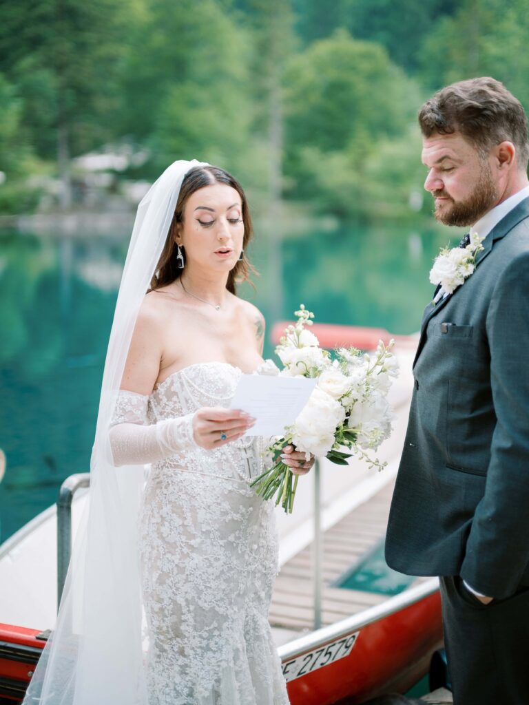 The ceremony took place on a floating bridge over the lake. From there, we had the perfect backdrop for stunning photos: the clear lake water and the majestic mountains in the distance. The couple recited their handwritten vows in the soft morning light, the gentle sound of the lake accompanying the natural atmosphere. Although their families were thousands of miles away in Miami, this moment was absolutely perfect. Switzerland seems to possess a magical quality, imbuing every experience with a special sense of intimacy and eternity.