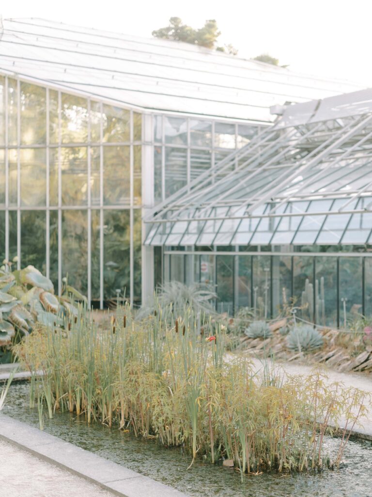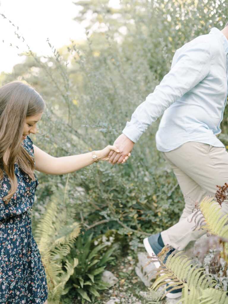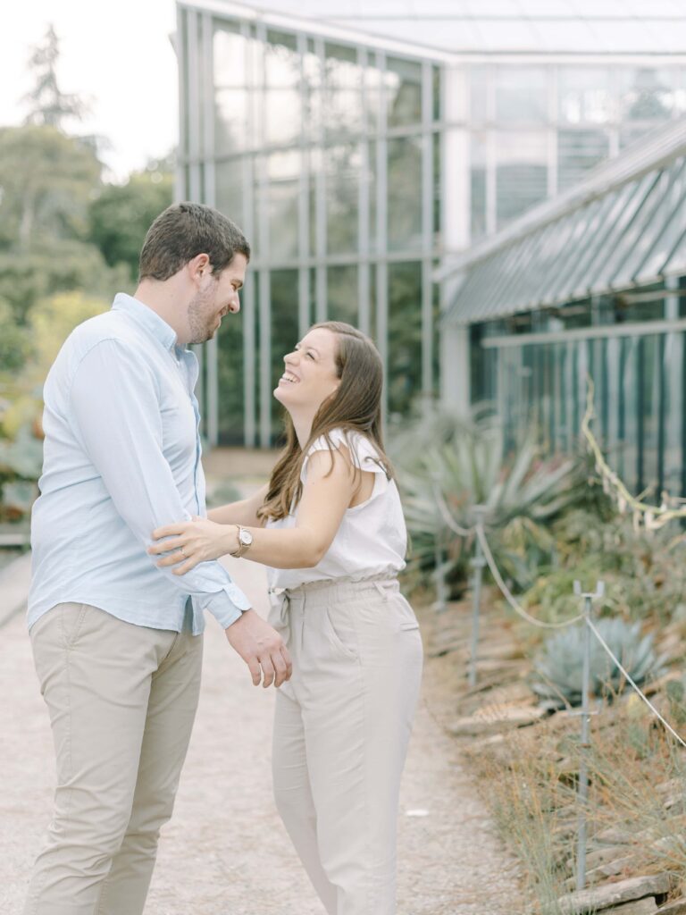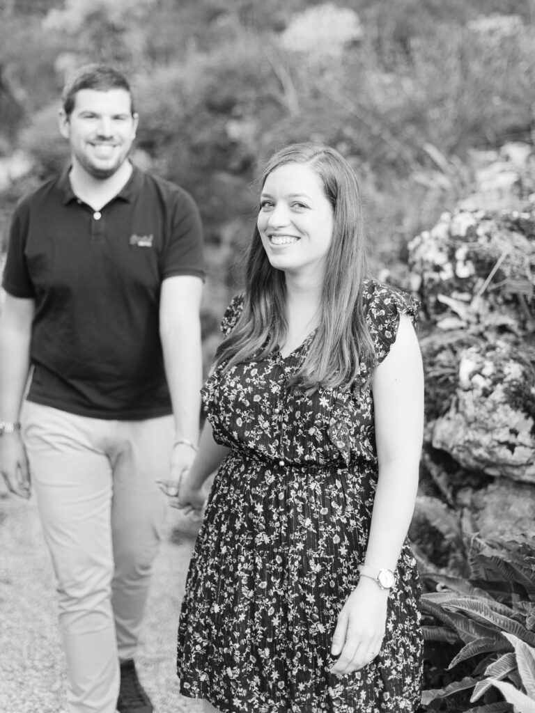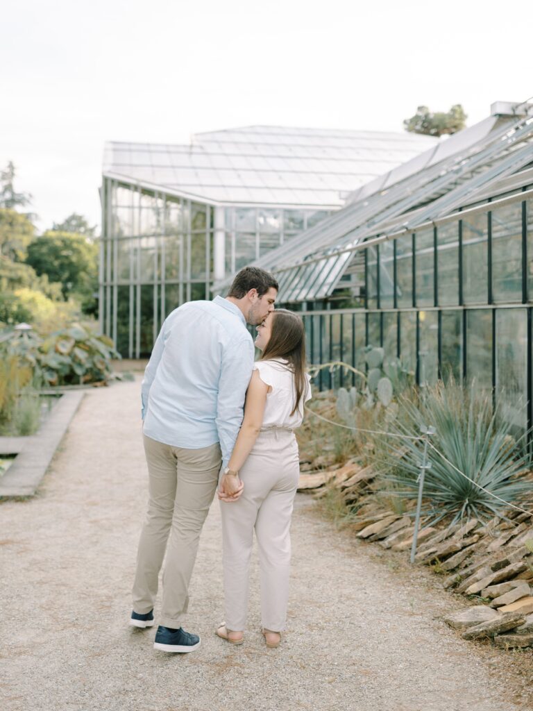 Walking through the botanical garden feels like stepping into another world. The landscape shifts from vibrant flowerbeds to quiet pathways bordered by ferns, Japanese maples, and roses. Every turn reveals a new composition—perfect for couples who want their engagement photos to feel both spontaneous and cinematic.